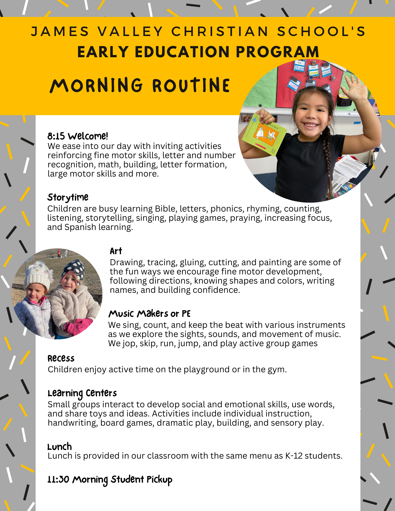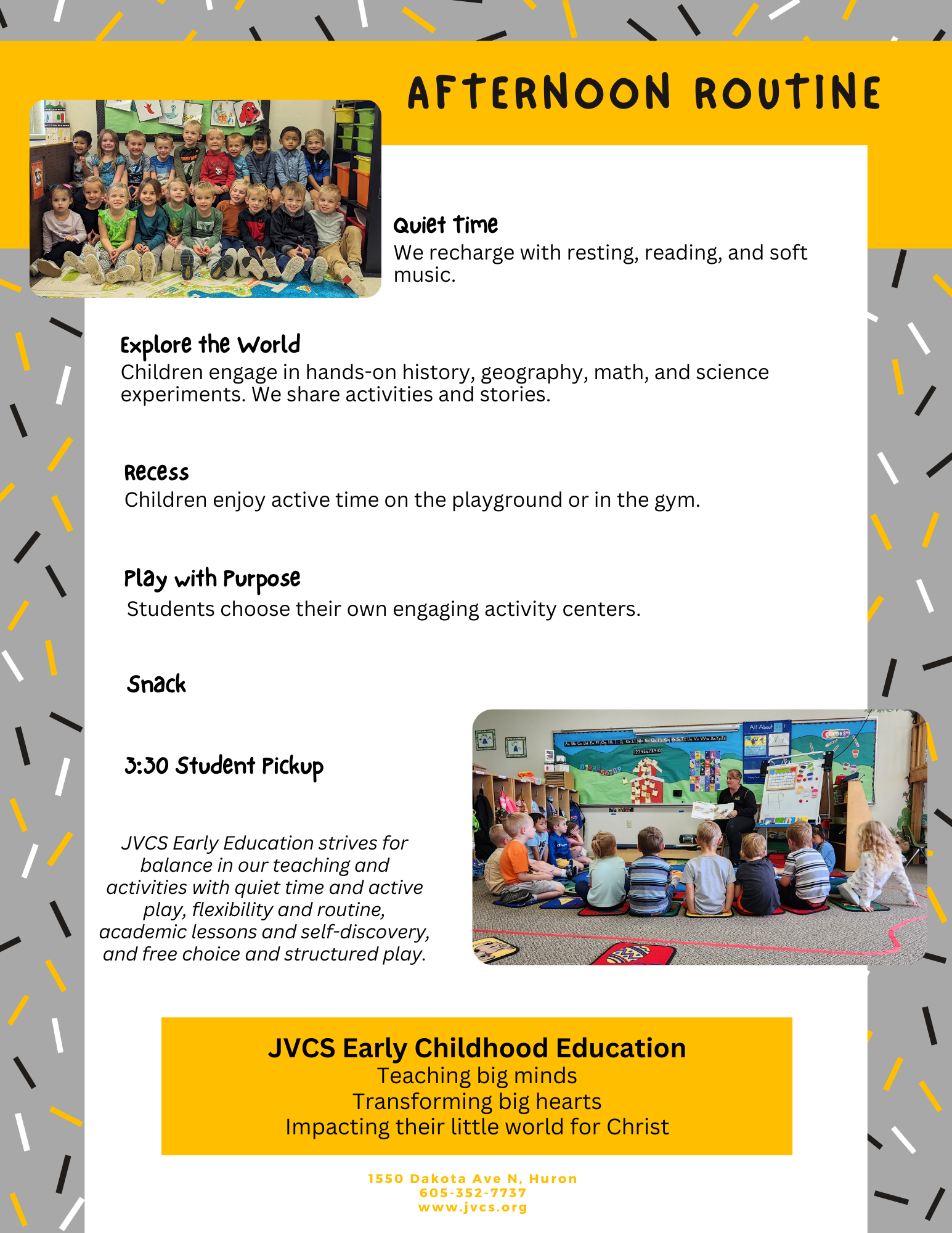 The early learning program at JVCS is a time of exploration, learning and growth! Our students experience learning in language development, attention span, fine and large motor development as well as growth as they gain confidence around others.